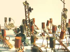 In contemporary art, the boundaries between the various applied arts, design and crafts have become blurred, and the use of various materials in sculpture and installations is an integral part of artistic expression and present-day artworks. Ido Noy uses goldsmith techniques in his artwork. The original goldsmith miniature designs of everyday objects, removed from their context, express our present reality in an original way. Noy is inspired by Tel-Aviv's buildings, observing them with the outsider's fresh point of view. Tel-Aviv, the so called "white city," is revealed as clustered, crowded and dense. The architectural space consists of an agglomeration of elements added over time, unplanned, in a chaotic and incidental process. The piled-up buildings and the objects attached appear to the young artist as ornaments; the electric poles, antennas, air-conditioners, and even garbage bins become decorations. The improvised and unaesthetic symbols of our ongoing hectic life are transformed into an infinite series of miniature artworks. The quantity is of importance, as a metaphor that emphasizes the feeling of the crowded urban space. New buildings are haphazardly added in between old, shabby ones; others receive new facades or elevations, and some are demolished to accommodate new shining towers that reach to the sky. Copper, bronze, brass, silver and gold are carefully crafted, cut and welded, flattened into small delicate objects of art. The detail and the whole in Ido's work provide a new and original perspective of the hundred year-old Tel Aviv. |